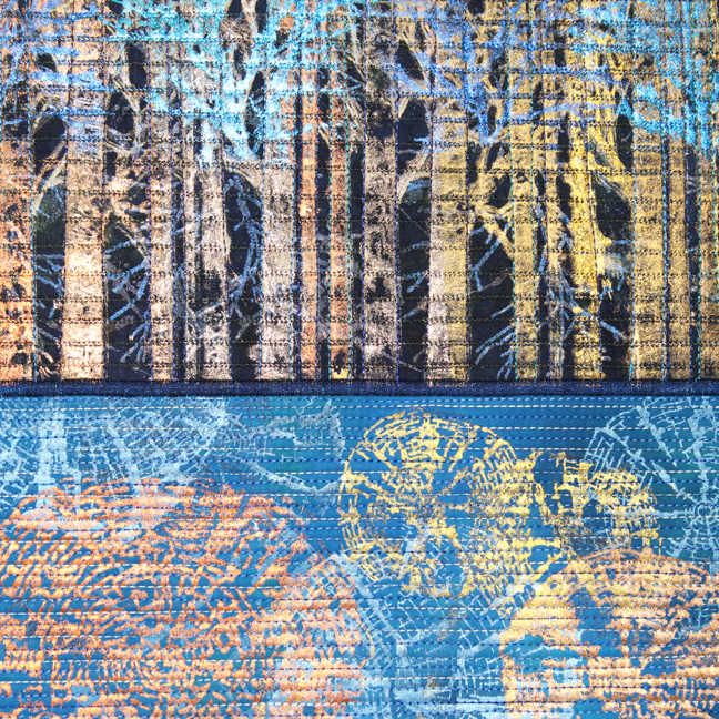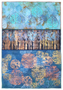 These mixed media fiber constructions may combine hand-dyed and painted cotton and silk fabrics, machine applique, screen-printing, metallic foil and leaf, metallic and rayon threads, heavily machine stitched.